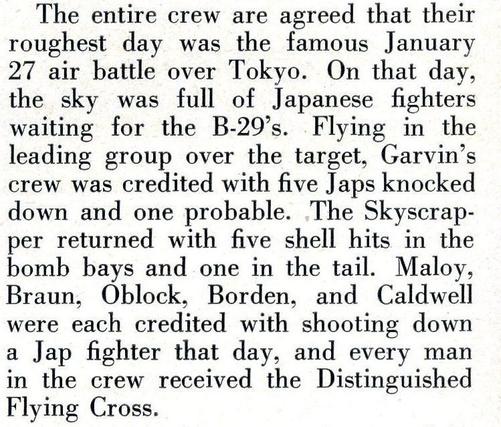 On January 27, 1945 the Garvin crew flew "Sky-Scrapper II" on its most dangerous and difficult mission of the war. The target was a Nakajima engine factory in Tokyo. As the 62 B-29's from the 73rd BW approached Tokyo, they were attacked 984 times by over 350 fighters. It was largest launch of fighters by the Japanese against B-29's. 5 B-29's were lost to enemy action. 60 fighters were shot down along with 56 probables destroyed. "Sky-Scrapper II" shot down 5 fighters. The dramatic day was noted in an article from The Guaranty News.